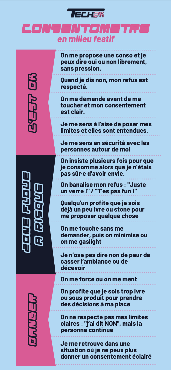 Notre collectif propose des formations et des outils et ressources pour rendre vos événements et vos espaces plus sûrs, inclusifs et accessibles. Destinées aux bars, clubs, festivals, collectifs et institutions, elles allient réduction des risques, prévention des violences et inclusivité.